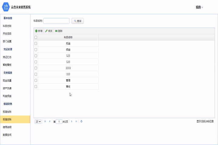 此模塊為極簡臺賬的配置表,配置對應的科目類型。擁有查詢功能。